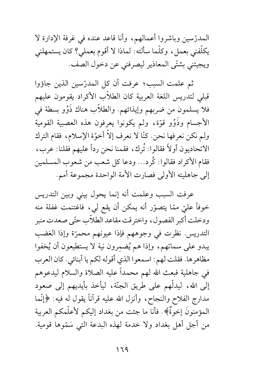 عرفت السبب وعلمت أنه إنما يحول بيني وبين التدريس خوفاً عليّ ممّا يتصوّر أنه يمكن أن يقع لي، فاغتنمت غفلة منه ودخلت أكبر الفصول، واخترقت مقاعد الطلاّب حتّى صعدت منبر التدريس. نظرت في وجوههم فإذا عيونهم محمرّة وإذا الغضب يبدو على سماتهم، وإذا هم يُضمِرون نية لا يستطيعون أن يُخفوا مظاهرها. فقلت لهم: اسمعوا الذي أقوله لكم يا أبنائي. كان العرب في جاهلية فبعث الله لهم محمداً عليه الصلاة والسلام ليدعوهم إلى الله، ليدلّهم على طريق الجنّة، ليأخذ بأيديهم إلى صعود مدارج الفلاح والنجاح، وأنزل الله عليه قرآناً يقول له فيه: {إنّما المؤمنونَ إخوةٌ}. فأنا ما جئت من بغداد إليكم لأعلّمكم العربية من أجل أهل بغداد ولا خدمة لهذه البدعة التي سَمّوها قومية.