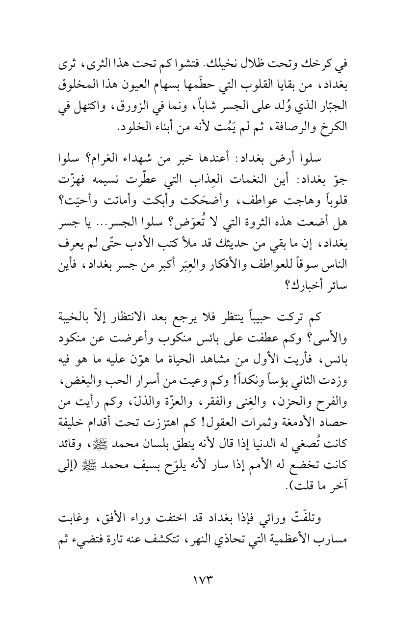 في كرخك وتحت ظلال نخيلك. فتشوا كم تحت هذا الثرى، ثرى بغداد، من بقايا القلوب التي حطّمها بسهام العيون هذا المخلوق الجبّار الذي وُلد على الجسر شاباً، ونما في الزورق، واكتهل في الكرخ والرصافة، ثم لم يَمُت لأنه من أبناء الخلود.