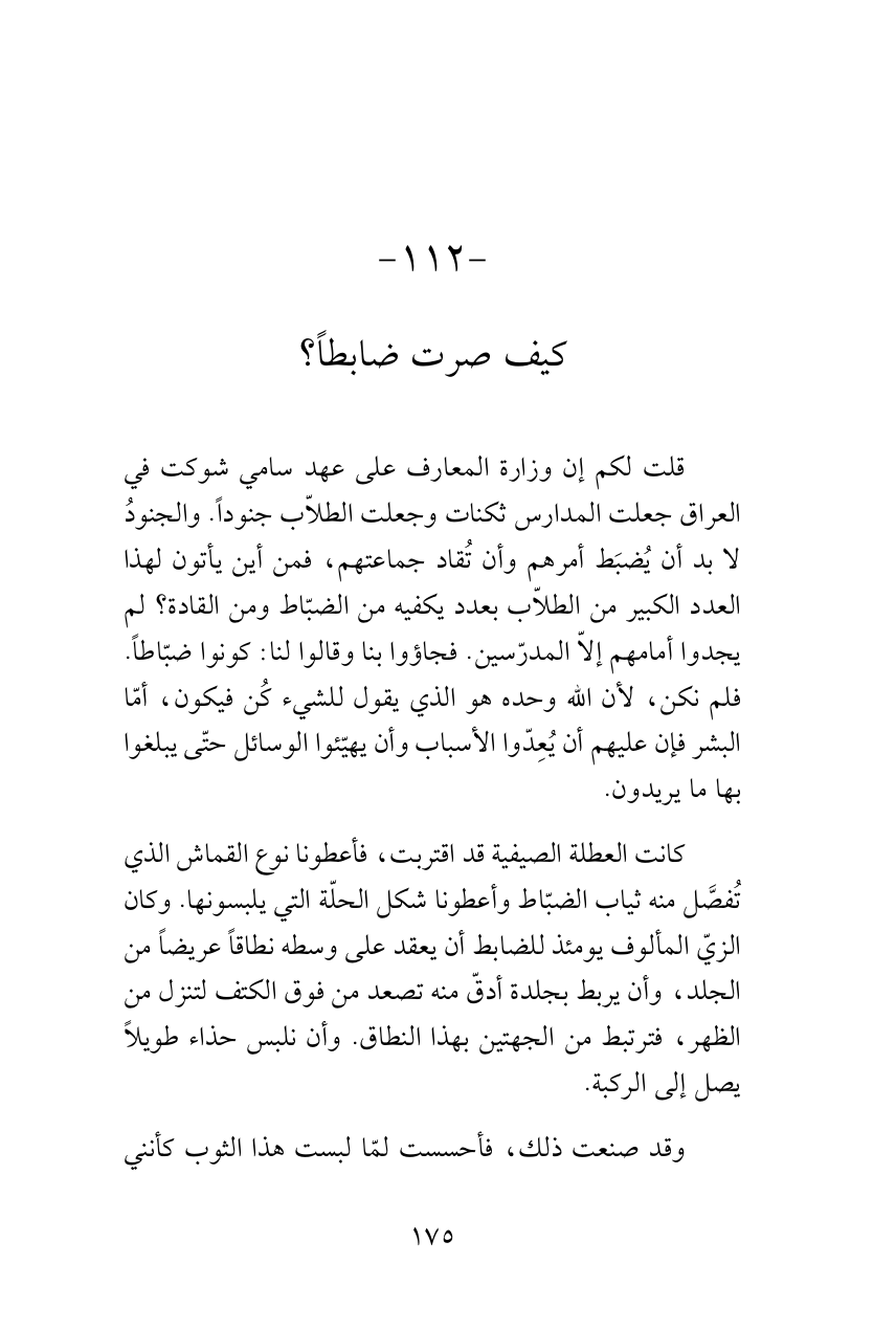 قلت لكم إن وزارة المعارف على عهد سامي شوكت في العراق جعلت المدارس ثكنات وجعلت الطلاّب جنوداً. والجنودُ لا بد أن يُضبَط أمرهم وأن تُقاد جماعتهم، فمن أين يأتون لهذا العدد الكبير من الطلاّب بعدد يكفيه من الضبّاط ومن القادة؟ لم يجدوا أمامهم إلاّ المدرّسين. فجاؤوا بنا وقالوا لنا: كونوا ضبّاطاً. فلم نكن، لأن الله وحده هو الذي يقول للشيء كُن فيكون، أمّا البشر فإن عليهم أن يُعِدّوا الأسباب وأن يهيّئوا الوسائل حتّى يبلغوا بها ما يريدون.