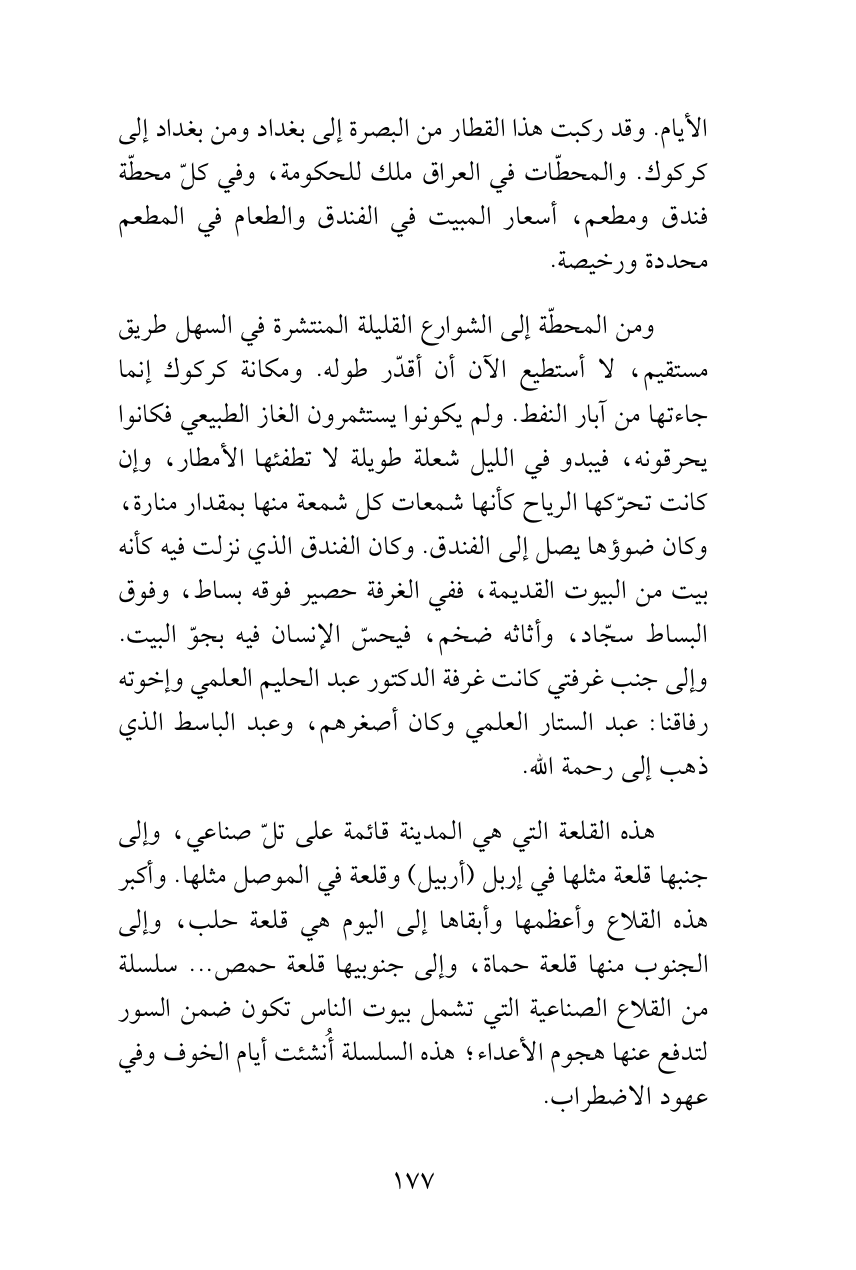 ومن المحطّة إلى الشوارع القليلة المنتشرة في السهل طريق مستقيم، لا أستطيع الآن أن أقدّر طوله. ومكانة كركوك إنما جاءتها من آبار النفط. ولم يكونوا يستثمرون الغاز الطبيعي فكانوا يحرقونه، فيبدو في الليل شعلة طويلة لا تطفئها الأمطار، وإن كانت تحرّكها الرياح كأنها شمعات كل شمعة منها بمقدار منارة، وكان ضوؤها يصل إلى الفندق. وكان الفندق الذي نزلت فيه كأنه بيت من البيوت القديمة، ففي الغرفة حصير فوقه بساط، وفوق البساط سجّاد، وأثاثه ضخم، فيحسّ الإنسان فيه بجوّ البيت. وإلى جنب غرفتي كانت غرفة الدكتور عبد الحليم العلمي وإخوته رفاقنا: عبد الستار العلمي وكان أصغرهم، وعبد الباسط الذي ذهب إلى رحمة الله.