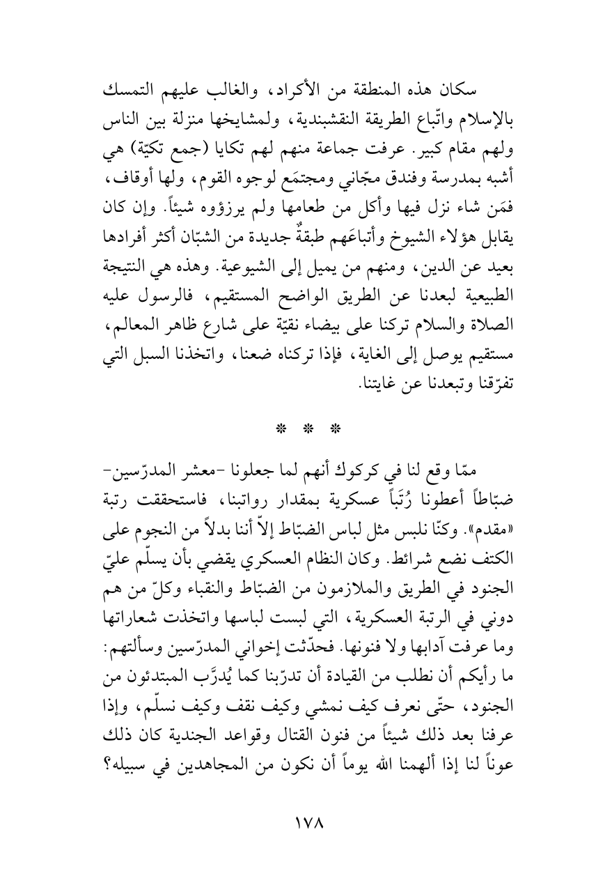 ممّا وقع لنا في كركوك أنهم لما جعلونا -معشر المدرّسين- ضبّاطاً أعطونا رُتَباً عسكرية بمقدار رواتبنا، فاستحققت رتبة «مقدم». وكنّا نلبس مثل لباس الضبّاط إلاّ أننا بدلاً من النجوم على الكتف نضع شرائط. وكان النظام العسكري يقضي بأن يسلّم عليّ الجنود في الطريق والملازمون من الضبّاط والنقباء وكلّ من هم دوني في الرتبة العسكرية، التي لبست لباسها واتخذت شعاراتها وما عرفت آدابها ولا فنونها. فحدّثت إخواني المدرّسين وسألتهم: ما رأيكم أن نطلب من القيادة أن تدرّبنا كما يُدرَّب المبتدئون من الجنود، حتّى نعرف كيف نمشي وكيف نقف وكيف نسلّم، وإذا عرفنا بعد ذلك شيئاً من فنون القتال وقواعد الجندية كان ذلك عوناً لنا إذا ألهمنا الله يوماً أن نكون من المجاهدين في سبيله؟