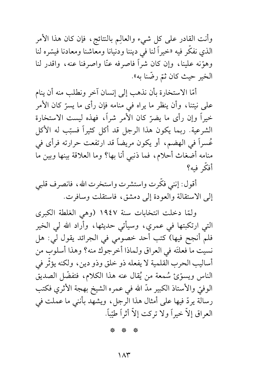 وأنت القادر على كل شيء والعالِم بالنتائج، فإن كان هذا الأمر الذي نفكّر فيه «خيراً لنا في ديننا ودنيانا ومعاشنا ومعادنا فيسّره لنا وهوّنه علينا، وإن كان شراً فاصرفه عنّا واصرفنا عنه، واقدر لنا الخير حيث كان ثمّ رضّنا به».