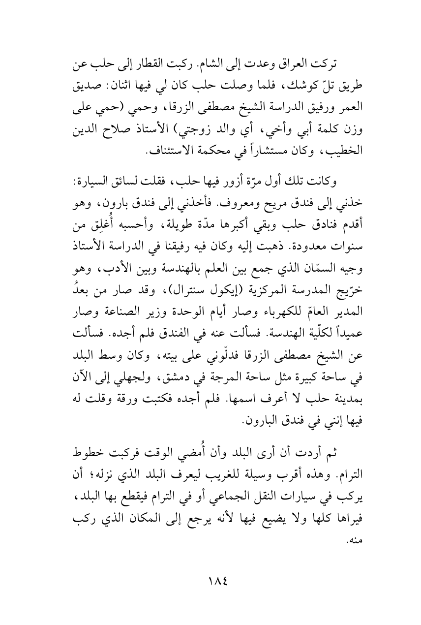 تركت العراق وعدت إلى الشام. ركبت القطار إلى حلب عن طريق تلّ كوشك، فلما وصلت حلب كان لي فيها اثنان: صديق العمر ورفيق الدراسة الشيخ مصطفى الزرقا، وحمي (حمي على وزن كلمة أبي وأخي، أي والد زوجتي) الأستاذ صلاح الدين الخطيب، وكان مستشاراً في محكمة الاستئناف.