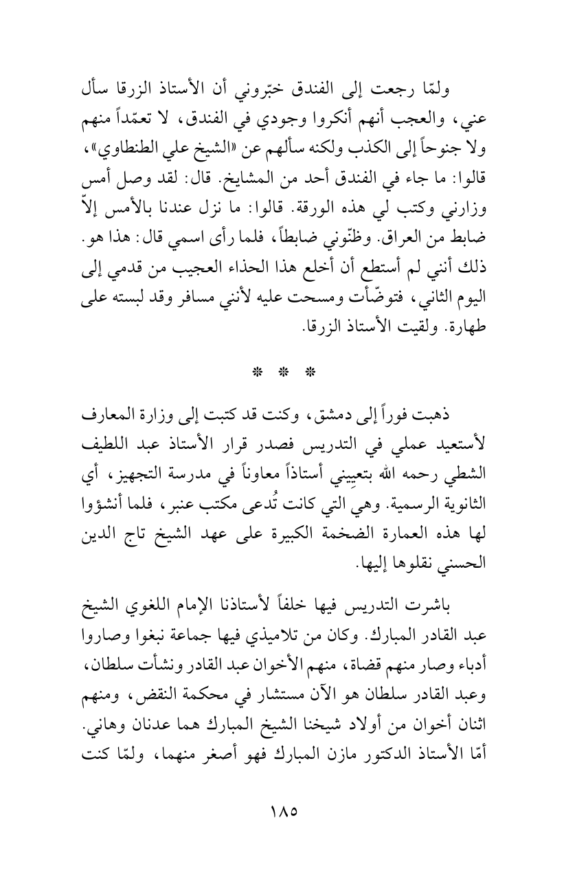 ولمّا رجعت إلى الفندق خبّروني أن الأستاذ الزرقا سأل عني، والعجب أنهم أنكروا وجودي في الفندق، لا تعمّداً منهم ولا جنوحاً إلى الكذب ولكنه سألهم عن «الشيخ علي الطنطاوي»، قالوا: ما جاء في الفندق أحد من المشايخ. قال: لقد وصل أمس وزارني وكتب لي هذه الورقة. قالوا: ما نزل عندنا بالأمس إلاّ ضابط من العراق. وظنّوني ضابطاً، فلما رأى اسمي قال: هذا هو. ذلك أنني لم أستطع أن أخلع هذا الحذاء العجيب من قدمي إلى اليوم الثاني، فتوضّأت ومسحت عليه لأنني مسافر وقد لبسته على طهارة. ولقيت الأستاذ الزرقا.