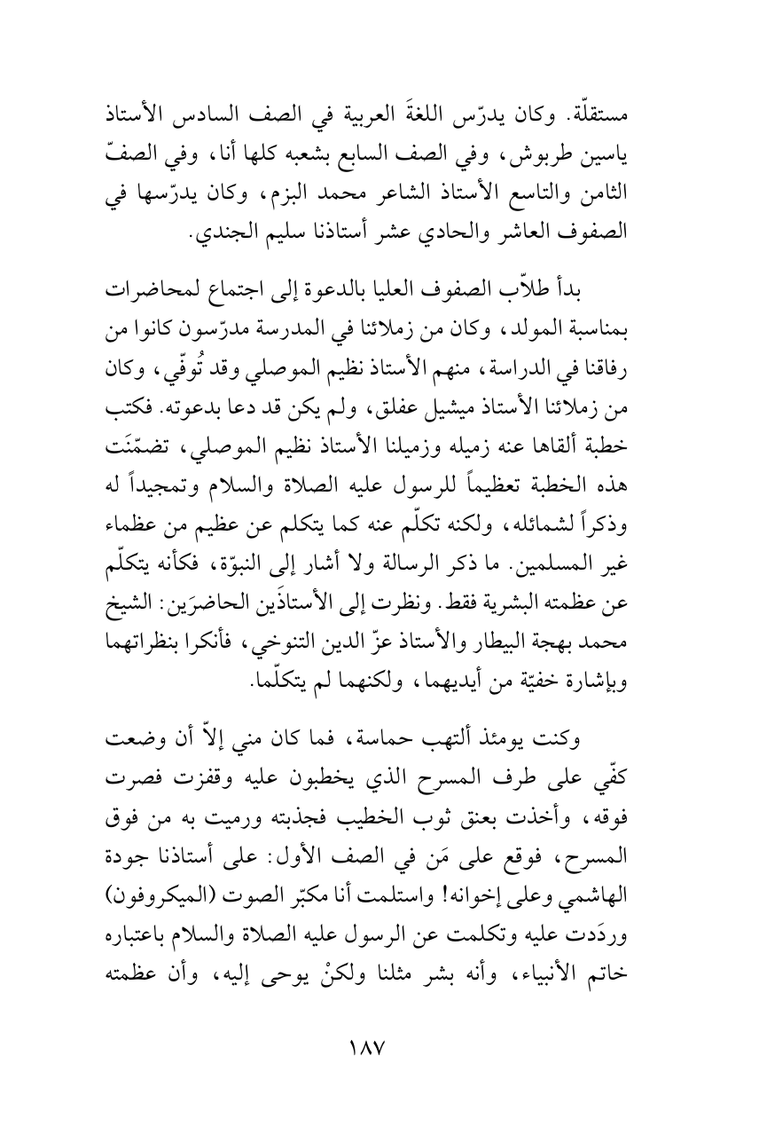 بدأ طلاّب الصفوف العليا بالدعوة إلى اجتماع لمحاضرات بمناسبة المولد، وكان من زملائنا في المدرسة مدرّسون كانوا من رفاقنا في الدراسة، منهم الأستاذ نظيم الموصلي وقد تُوفّي، وكان من زملائنا الأستاذ ميشيل عفلق، ولم يكن قد دعا بدعوته. فكتب خطبة ألقاها عنه زميله وزميلنا الأستاذ نظيم الموصلي، تضمّنَت هذه الخطبة تعظيماً للرسول عليه الصلاة والسلام وتمجيداً له وذكراً لشمائله، ولكنه تكلّم عنه كما يتكلم عن عظيم من عظماء غير المسلمين. ما ذكر الرسالة ولا أشار إلى النبوّة، فكأنه يتكلّم عن عظمته البشرية فقط. ونظرت إلى الأستاذَين الحاضرَين: الشيخ محمد بهجة البيطار والأستاذ عزّ الدين التنوخي، فأنكرا بنظراتهما وبإشارة خفيّة من أيديهما، ولكنهما لم يتكلّما.