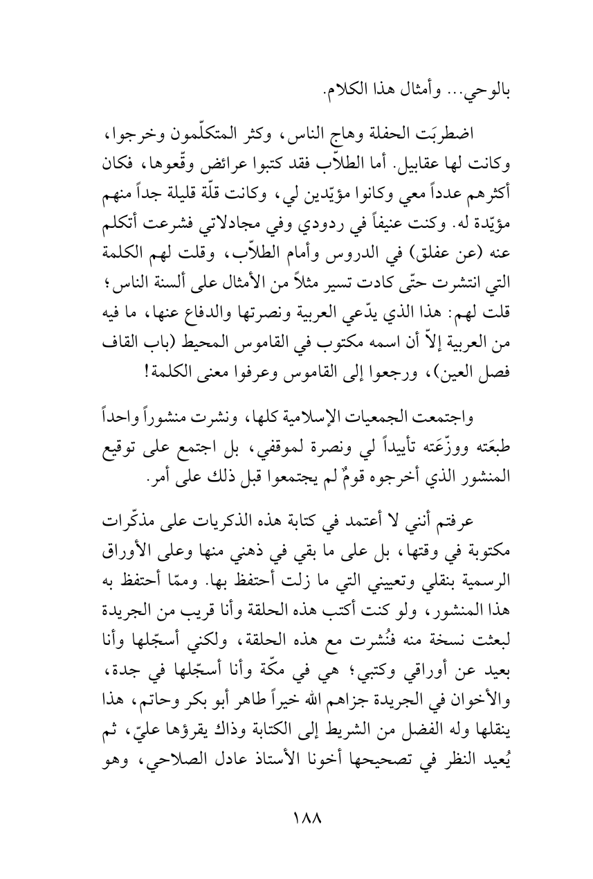 عرفتم أنني لا أعتمد في كتابة هذه الذكريات على مذكّرات مكتوبة في وقتها، بل على ما بقي في ذهني منها وعلى الأوراق الرسمية بنقلي وتعييني التي ما زلت أحتفظ بها. وممّا أحتفظ به هذا المنشور، ولو كنت أكتب هذه الحلقة وأنا قريب من الجريدة لبعثت نسخة منه فنُشرت مع هذه الحلقة، ولكني أسجّلها وأنا بعيد عن أوراقي وكتبي؛ هي في مكّة وأنا أسجّلها في جدة، والأخوان في الجريدة جزاهم الله خيراً طاهر أبو بكر وحاتم، هذا ينقلها وله الفضل من الشريط إلى الكتابة وذاك يقرؤها عليّ، ثم يُعيد النظر في تصحيحها أخونا الأستاذ عادل الصلاحي، وهو