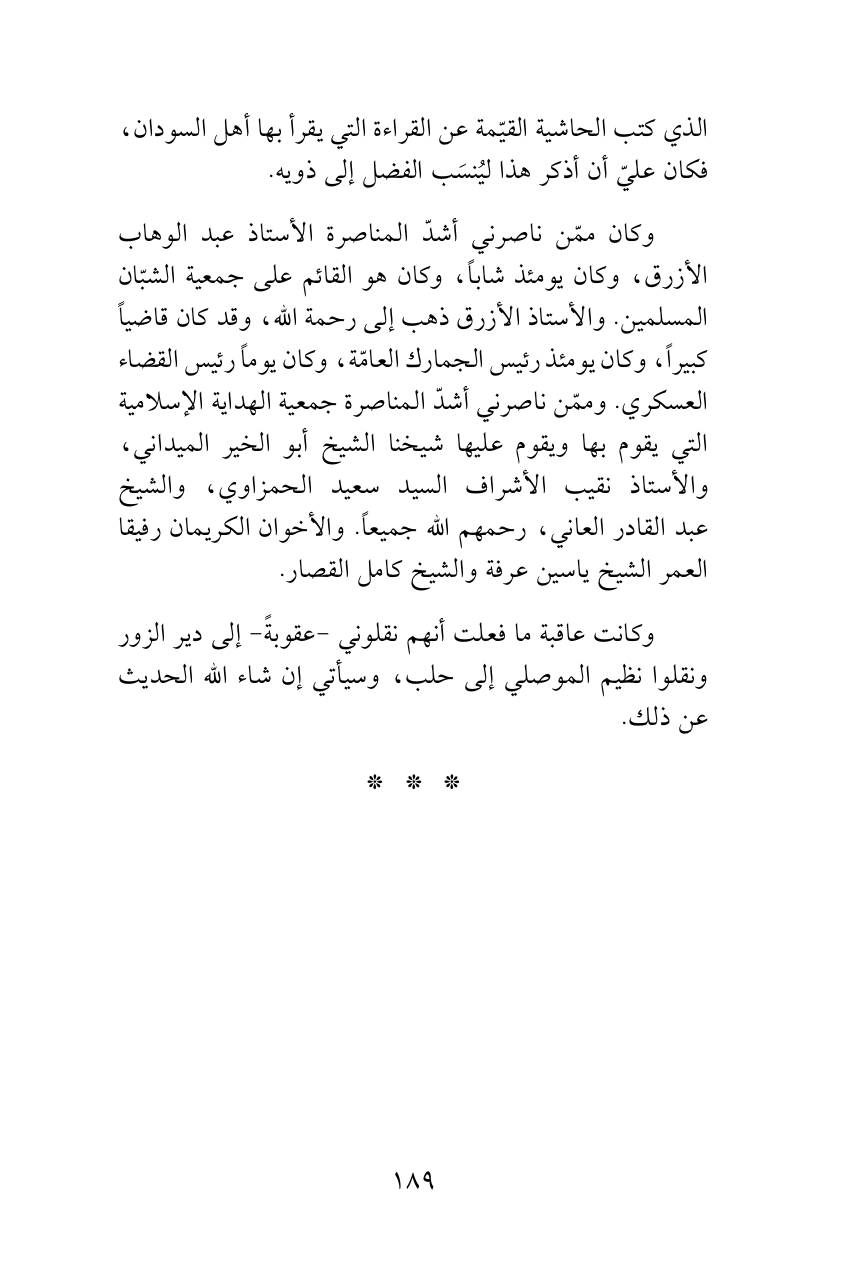 وكان ممّن ناصرني أشدّ المناصرة الأستاذ عبد الوهاب الأزرق، وكان يومئذ شاباً، وكان هو القائم على جمعية الشبّان المسلمين. والأستاذ الأزرق ذهب إلى رحمة الله، وقد كان قاضياً كبيراً، وكان يومئذ رئيس الجمارك العامّة، وكان يوماً رئيس القضاء العسكري. وممّن ناصرني أشدّ المناصرة جمعية الهداية الإسلامية التي يقوم بها ويقوم عليها شيخنا الشيخ أبو الخير الميداني، والأستاذ نقيب الأشراف السيد سعيد الحمزاوي، والشيخ عبدالقادر العاني، رحمهم الله جميعاً. والأخوان الكريمان رفيقا العمر الشيخ ياسين عرفة والشيخ كامل القصار.