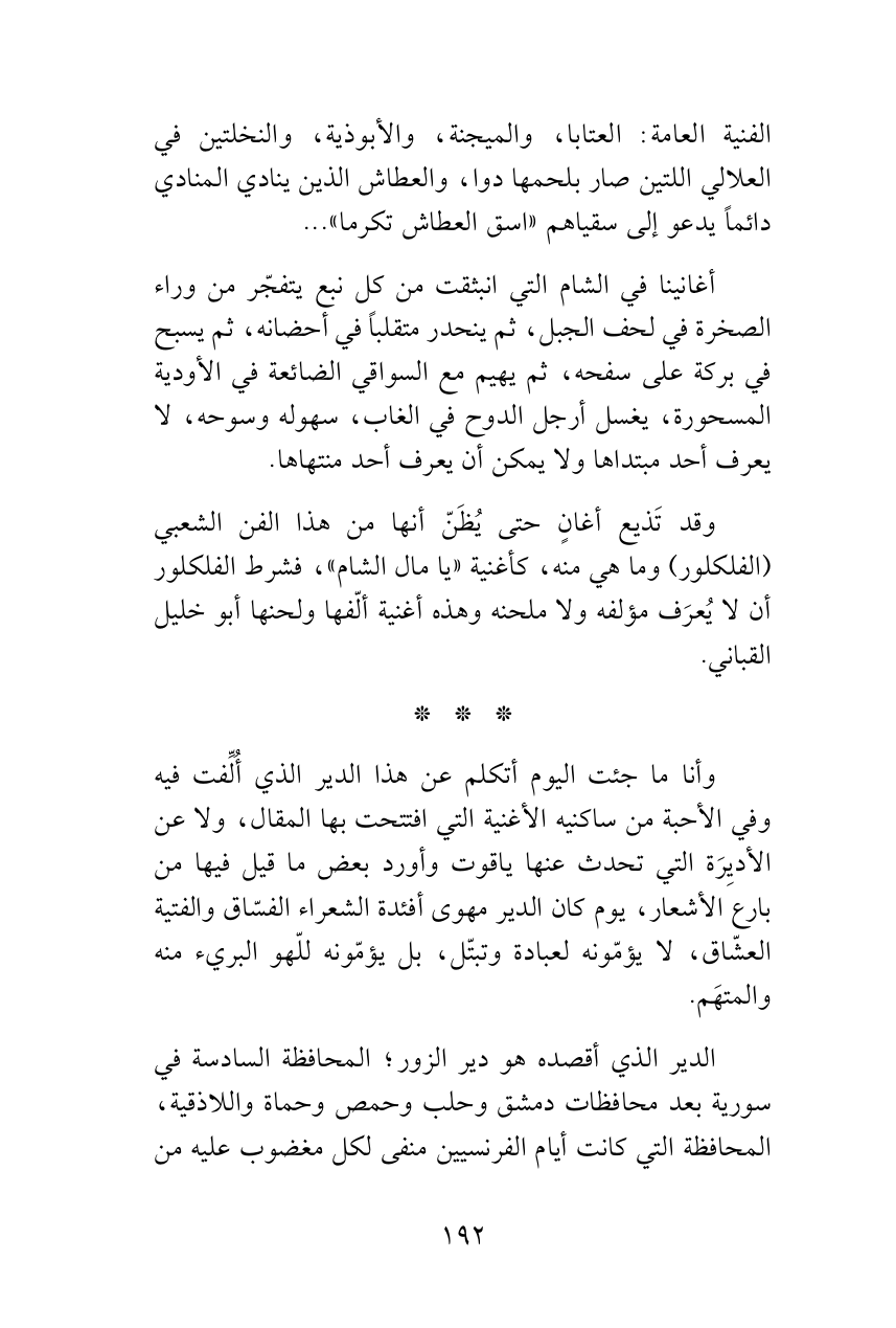 وأنا ما جئت اليوم أتكلم عن هذا الدير الذي أُلِّفت فيه وفي الأحبة من ساكنيه الأغنية التي افتتحت بها المقال، ولا عن الأديِرَة التي تحدث عنها ياقوت وأورد بعض ما قيل فيها من بارع الأشعار، يوم كان الدير مهوى أفئدة الشعراء الفسّاق والفتية العشّاق، لا يؤمّونه لعبادة وتبتّل، بل يؤمّونه للهو البريء منه والمتهَم.
