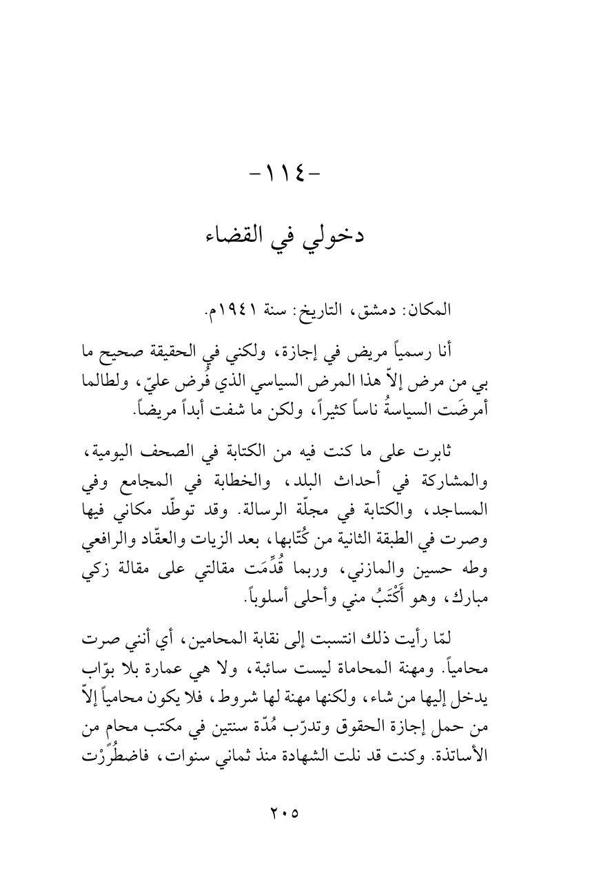 لمّا رأيت ذلك انتسبت إلى نقابة المحامين، أي أنني صرت محامياً. ومهنة المحاماة ليست سائبة، ولا هي عمارة بلا بوّاب يدخل إليها من شاء، ولكنها مهنة لها شروط، فلا يكون محامياً إلاّ من حمل إجازة الحقوق وتدرّب مُدّة سنتين في مكتب محامٍ من الأساتذة. وكنت قد نلت الشهادة منذ ثماني سنوات، فاضطُررْت