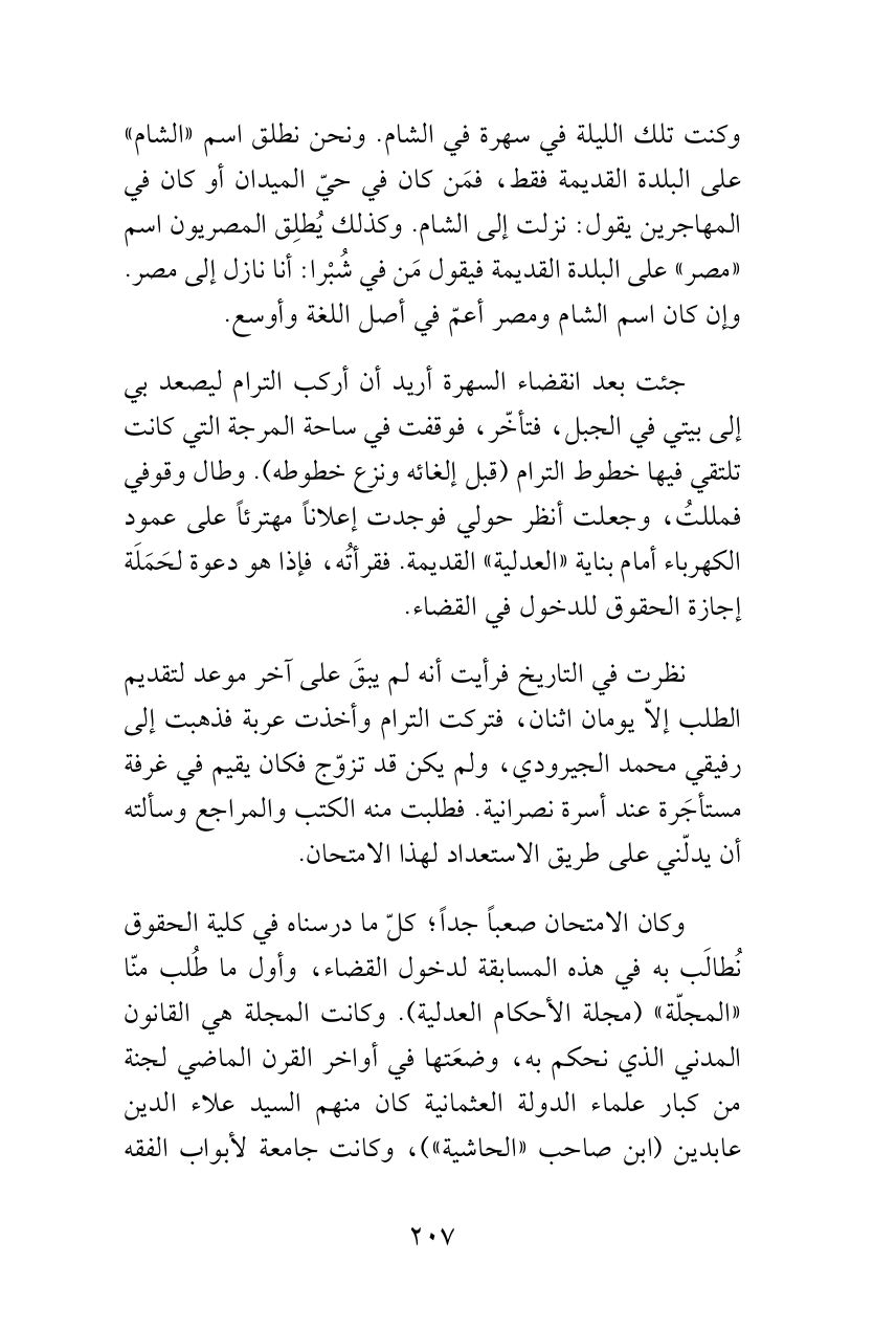 جئت بعد انقضاء السهرة أريد أن أركب الترام ليصعد بي إلى بيتي في الجبل، فتأخّر، فوقفت في ساحة المرجة التي كانت تلتقي فيها خطوط الترام (قبل إلغائه ونزع خطوطه). وطال وقوفي فمللتُ، وجعلت أنظر حولي فوجدت إعلاناً مهترئاً على عمود الكهرباء أمام بناية «العدلية» القديمة. فقرأتُه، فإذا هو دعوة لحَمَلَة إجازة الحقوق للدخول في القضاء.