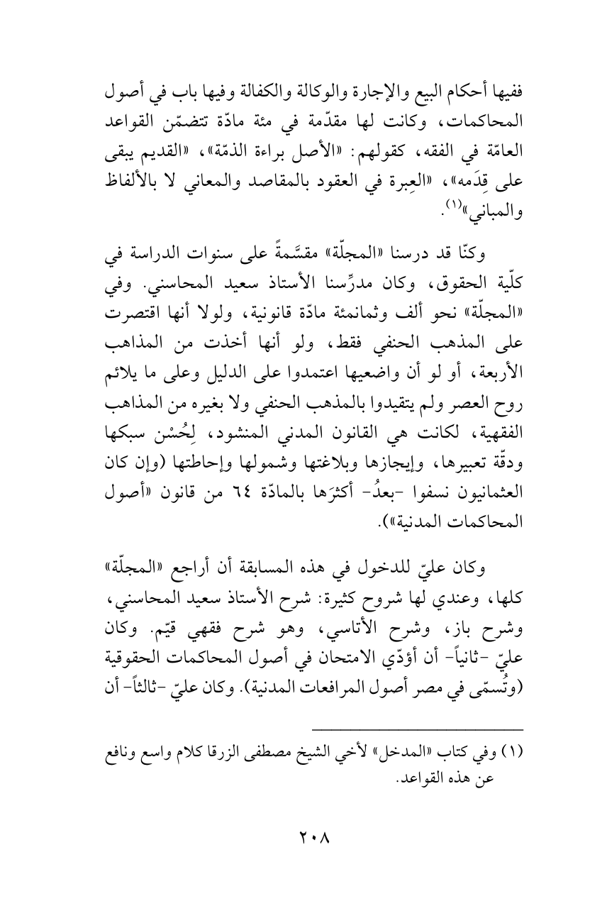 وكنّا قد درسنا «المجلّة» مقسَّمةً على سنوات الدراسة في كلّية الحقوق، وكان مدرِّسنا الأستاذ سعيد المحاسني. وفي «المجلّة» نحو ألف وثمانمئة مادّة قانونية، ولولا أنها اقتصرت على المذهب الحنفي فقط، ولو أنها أخذت من المذاهب الأربعة، أو لو أن واضعيها اعتمدوا على الدليل وعلى ما يلائم روح العصر ولم يتقيدوا بالمذهب الحنفي ولا بغيره من المذاهب الفقهية، لكانت هي القانون المدني المنشود، لِحُسْن سبكها ودقّة تعبيرها، وإيجازها وبلاغتها وشمولها وإحاطتها (وإن كان العثمانيون نسفوا -بعدُ- أكثرَها بالمادّة 64 من قانون «أصول المحاكمات المدنية»).