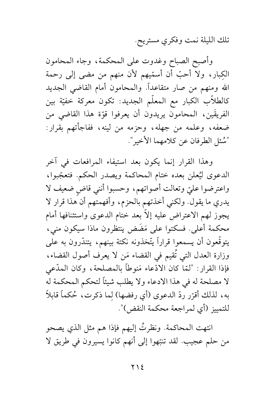 وأصبح الصباح وغدوت على المحكمة، وجاء المحامون الكِبار، ولا أحبّ أن أسمّيهم لأن منهم من مضى إلى رحمة الله ومنهم من صار متقاعداً. والمحامون أمام القاضي الجديد كالطلاّب الكبار مع المعلّم الجديد: تكون معركة خفيّة بين الفريقَين، المحامون يريدون أن يعرفوا قوّة هذا القاضي من ضعفه، وعلمه من جهله، وحزمه من لينه، ففاجأتهم بقرار: "سُئل الطرفان عن كلامهما الأخير".