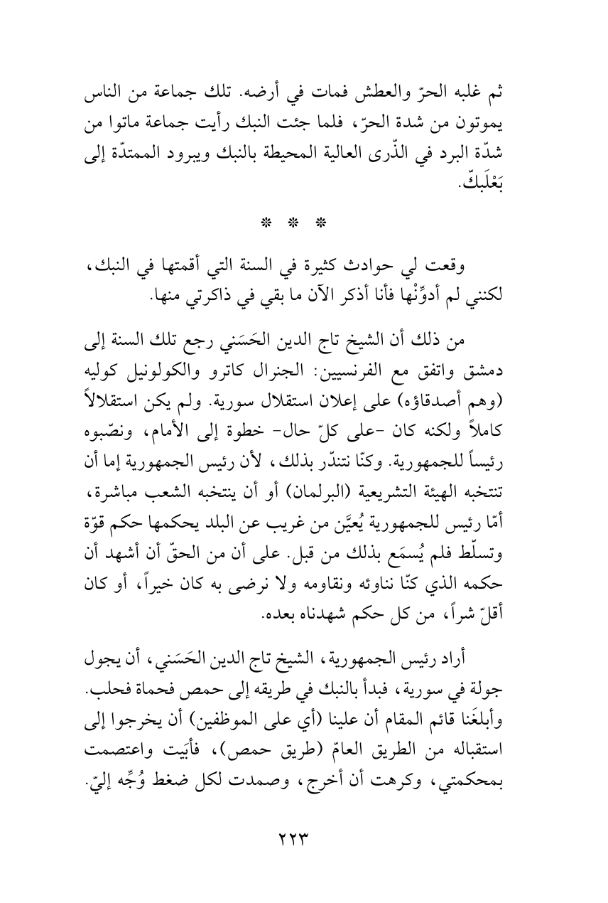 من ذلك أن الشيخ تاج الدين الحَسَني رجع تلك السنة إلى دمشق واتفق مع الفرنسيين: الجنرال كاترو والكولونيل كوليه (وهم أصدقاؤه) على إعلان استقلال سورية. ولم يكن استقلالاً كاملاً ولكنه كان -على كلّ حال- خطوة إلى الأمام، ونصّبوه رئيساً للجمهورية. وكنّا نتندّر بذلك، لأن رئيس الجمهورية إما أن تنتخبه الهيئة التشريعية (البرلمان) أو أن ينتخبه الشعب مباشرة، أمّا رئيس للجمهورية يُعيَّن من غريب عن البلد يحكمها حكم قوّة وتسلّط فلم يُسمَع بذلك من قبل. على أن من الحقّ أن أشهد أن حكمه الذي كنّا نناوئه ونقاومه ولا نرضى به كان خيراً، أو كان أقلّ شراً، من كل حكم شهدناه بعده.