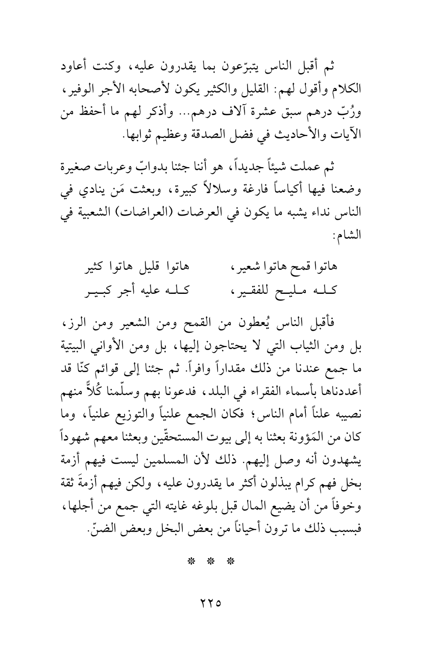 ثم أقبل الناس يتبرّعون بما يقدرون عليه، وكنت أعاود الكلام وأقول لهم: القليل والكثير يكون لأصحابه الأجر الوفير، ورُبّ درهم سبق عشرة آلاف درهم ... وأذكر لهم ما أحفظ من الآيات والأحاديث في فضل الصدقة وعظيم ثوابها.