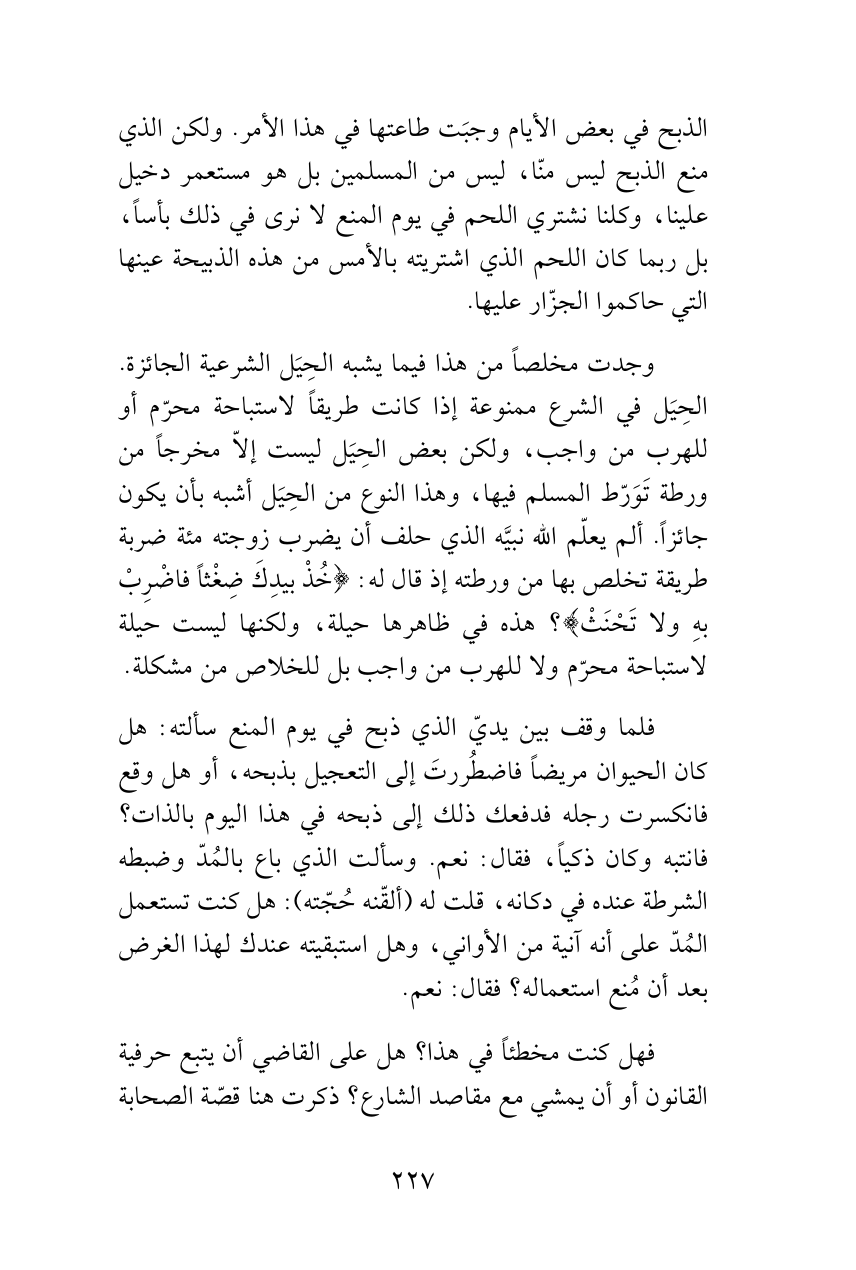 الذبح في بعض الأيام وجبَت طاعتها في هذا الأمر. ولكن الذي منع الذبح ليس منّا، ليس من المسلمين بل هو مستعمر دخيل علينا، وكلنا نشتري اللحم في يوم المنع لا نرى في ذلك بأساً، بل ربما كان اللحم الذي اشتريته بالأمس من هذه الذبيحة عينها التي حاكموا الجزّار عليها.