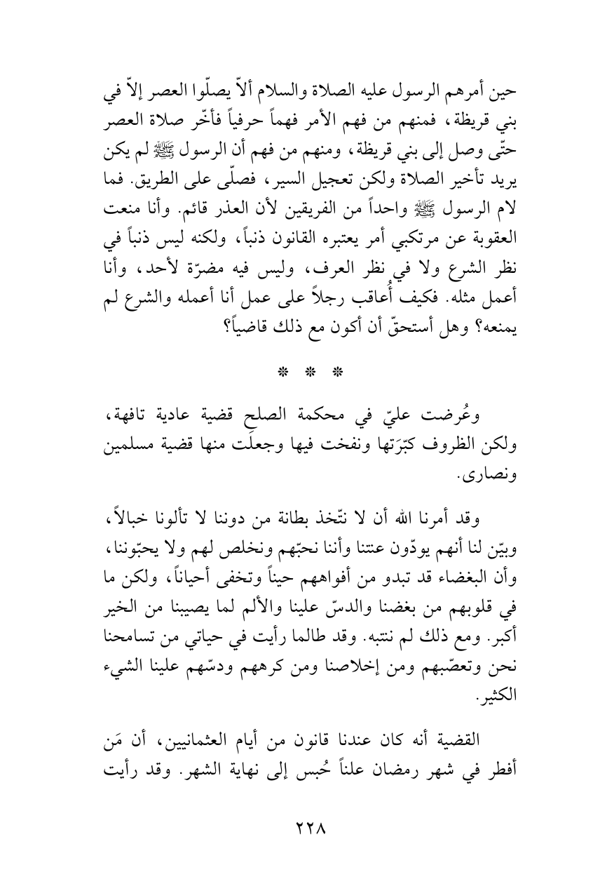 حين أمرهم الرسول عليه الصلاة والسلام ألاّ يصلّوا العصر إلاّ في بني قريظة، فمنهم من فهم الأمر فهماً حرفياً فأخّر صلاة العصر حتّى وصل إلى بني قريظة، ومنهم من فهم أن الرسول ‘ لم يكن يريد تأخير الصلاة ولكن تعجيل السير، فصلّى على الطريق. فما لام الرسول ‘ واحداً من الفريقين لأن العذر قائم. وأنا منعت العقوبة عن مرتكبي أمر يعتبره القانون ذنباً، ولكنه ليس ذنباً في نظر الشرع ولا في نظر العرف، وليس فيه مضرّة لأحد، وأنا أعمل مثله. فكيف أُعاقب رجلاً على عمل أنا أعمله والشرع لم يمنعه؟ وهل أستحقّ أن أكون مع ذلك قاضياً؟