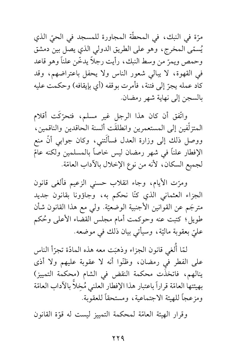 واتّفق أن كان هذا الرجل غير مسلم، فتحرّكَت أقلام المتزلّفين إلى المستعمرين وانطلقَت ألسنة الحاقدين والناقمين، ووصل ذلك إلى وزارة العدل فسألَتني، وكان جوابي أنّ منع الإفطار علناً في شهر رمضان ليس خاصاً بالمسلمين ولكنه عامّ لجميع السكان، لأنه من نوع الإخلال بالآداب العامّة.