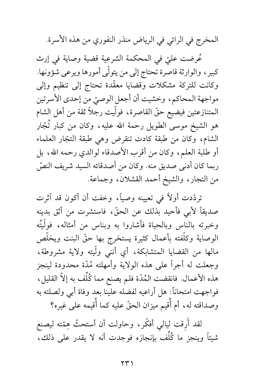 عُرضت عليّ في المحكمة الشرعية قضية وصاية في إرث كبير، والوارثة قاصرة تحتاج إلى من يتولّى أمورها ويرعى شؤونها. وكانت للتركة مشكلات وقضايا معقّدة تحتاج إلى تنظيم وإلى مواجهة المحاكم، وخشيت أن أجعل الوصيّ من إحدى الأسرتين المتنازعتين فيضيع حقّ القاصرة، فولّيت رجلاً ثقة من أهل الشام هو الشيخ موسى الطويل رحمة الله عليه، وكان من كبار تُجّار الشام، وكان من طبقة كادت تنقرض وهي طبقة التجّار العلماء أو طلبة العلم، وكان من أقرب الأصدقاء لوالدي رحمه الله، بل ربما كان أدنى صديق منه. وكان من أصدقائه السيد شريف النصّ من التجار، والشيخ أحمد القشلان، وجماعة.