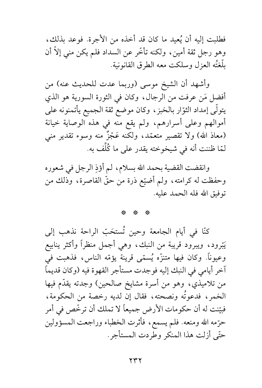 فطلبت إليه أن يُعيد ما كان قد أخذه من الأجرة. فوعد بذلك، وهو رجل ثقة أمين، ولكنه تأخّر عن السداد فلم يكن مني إلاّ أن بلّغتُه العزل وسلكت معه الطرق القانونية.