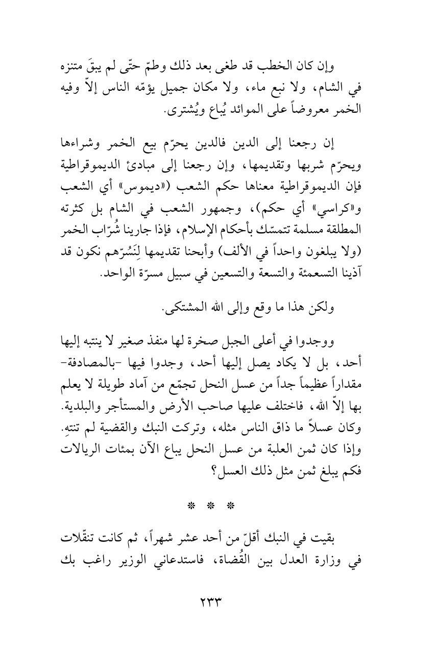 إن رجعنا إلى الدين فالدين يحرّم بيع الخمر وشراءها ويحرّم شربها وتقديمها، وإن رجعنا إلى مبادئ الديموقراطية فإن الديموقراطية معناها حكم الشعب («ديموس» أي الشعب و «كراسي» أي حكم)، وجمهور الشعب في الشام بل كثرته المطلقة مسلمة تتمسّك بأحكام الإسلام، فإذا جارينا شُرّاب الخمر (ولا يبلغون واحداً في الألف) وأبحنا تقديمها لِنَسُرّهم نكون قد آذينا التسعمئة والتسعة والتسعين في سبيل مسرّة الواحد.