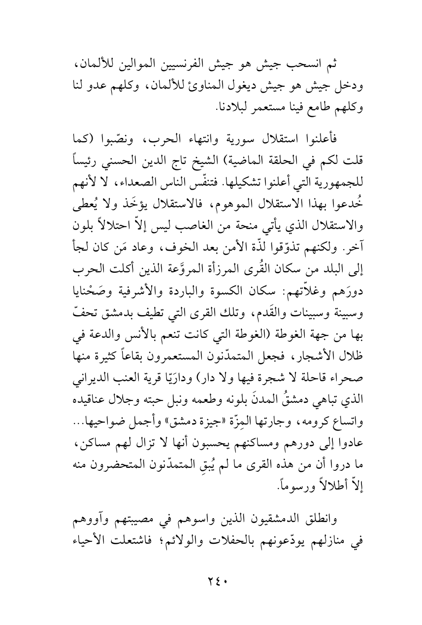 فأعلنوا استقلال سورية وانتهاء الحرب، ونصّبوا (كما قلت لكم في الحلقة الماضية) الشيخ تاج الدين الحسني رئيساً للجمهورية التي أعلنوا تشكيلها. فتنفّس الناس الصعداء، لا لأنهم خُدعوا بهذا الاستقلال الموهوم، فالاستقلال يؤخَذ ولا يُعطى والاستقلال الذي يأتي منحة من الغاصب ليس إلاّ احتلالاً بلون آخر. ولكنهم تذوّقوا لذّة الأمن بعد الخوف، وعاد مَن كان لجأ إلى البلد من سكان القُرى المرزأة المروَّعة الذين أكلت الحرب دورَهم وغلاّتهم: سكان الكسوة والباردة والأشرفية وصَحْنايا وسبينة وسبينات والقَدم، وتلك القرى التي تطيف بدمشق تحفّ بها من جهة الغوطة (الغوطة التي كانت تنعم بالأنس والدعة في ظلال الأشجار، فجعل المتمدّنون المستعمرون بقاعاً كثيرة منها صحراء قاحلة لا شجرة فيها ولا دار) ودارَيّا قرية العنب الديراني الذي تباهي دمشقُ المدنَ بلونه وطعمه ونبل حبته وجلال عناقيده واتساع كرومه، وجارتها المِزّة «جيزة دمشق» وأجمل ضواحيها ... عادوا إلى دورهم ومساكنهم يحسبون أنها لا تزال لهم مساكن، ما دروا أن من هذه القرى ما لم يُبقِ المتمدّنون المتحضرون منه إلاّ أطلالاً ورسوماً.