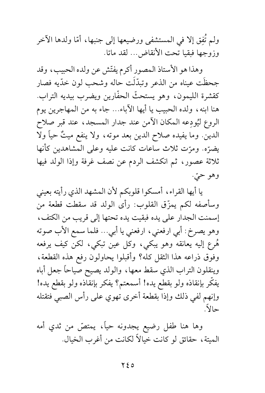 وهذا هو الأستاذ المصور أكرم يفتّش عن ولده الحبيب، وقد جحظَت عيناه من الذعر وتبدّلَت حاله وشحب لون خدّيه فصار كقشرة الليمون، وهو يستحثّ الحفّارين ويضرب بيديه التراب. هنا ابنه، ولده الحبيب يا أيها الآباء ... جاء به من المهاجرين يوم الروع ليُودِعه المكان الآمن عند جدار المسجد، عند قبر صلاح الدين. وما يفيده صلاح الدين بعد موته، ولا ينفع ميتٌ حياً ولا يضرّه. ومرّت ثلاث ساعات كانت عليه وعلى المشاهدين كأنها ثلاثة عصور، ثم انكشف الردم عن نصف غرفة وإذا الولد فيها وهو حيّ.