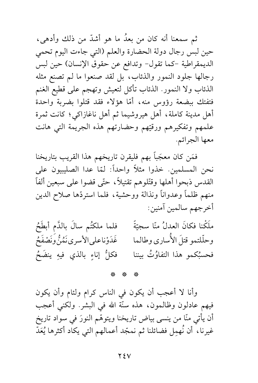 وأنا لا أعجب أن يكون في الناس كرام ولئام وأن يكون فيهم عادلون وظالمون، هذه سنّة الله في البشر. ولكني أعجب أن يأتي منّا من ينسى بياض تاريخنا ويتوهّم النورَ في سواد تاريخ غيرنا، أن نُهمِل فضائلنا ثم نمجّد أعمالهم التي يكاد أكثرها يُعَدّ