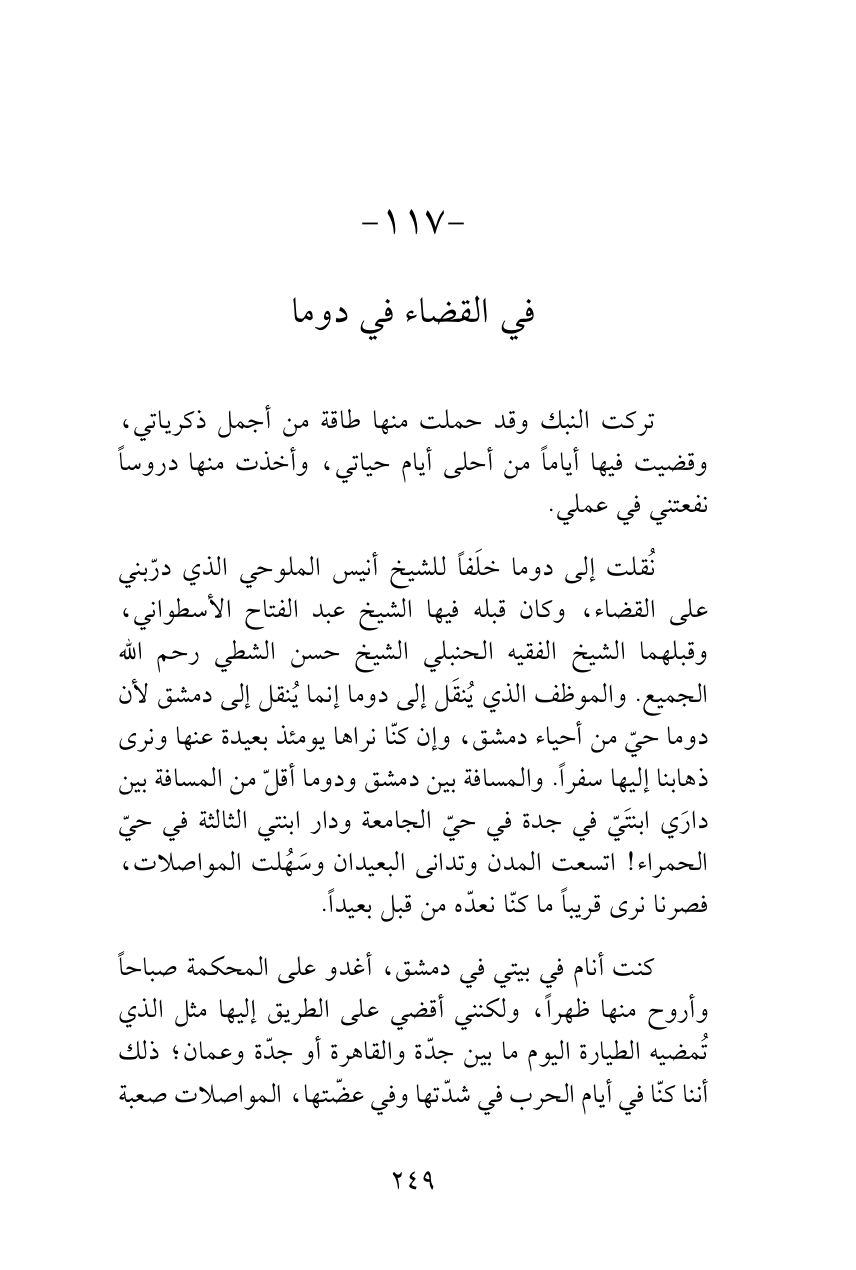 نُقلت إلى دوما خلَفاً للشيخ أنيس الملوحي الذي درّبني على القضاء، وكان قبله فيها الشيخ عبد الفتاح الأسطواني، وقبلهما الشيخ الفقيه الحنبلي الشيخ حسن الشطي رحم الله الجميع. والموظف الذي يُنقَل إلى دوما إنما يُنقل إلى دمشق لأن دوما حيّ من أحياء دمشق، وإن كنّا نراها يومئذ بعيدة عنها ونرى ذهابنا إليها سفراً. والمسافة بين دمشق ودوما أقلّ من المسافة بين دارَي ابنتَيّ في جدة في حيّ الجامعة ودار ابنتي الثالثة في حيّ الحمراء! اتسعت المدن وتدانى البعيدان وسَهُلت المواصلات، فصرنا نرى قريباً ما كنّا نعدّه من قبل بعيداً.