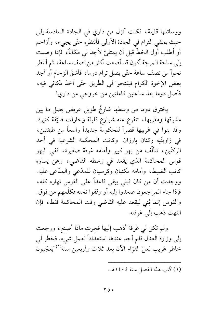 ولم تكن لي غرفة أذهب إليها فحِرت ماذا أصنع، ورجعت إلى وزارة العدل فلم أجد عندها استعداداً لعمل شيء. فخطر لي خاطر غريب لعلّ القرّاء الآن بعد ثلاث وأربعين سنة (¬1) يَعجَبون