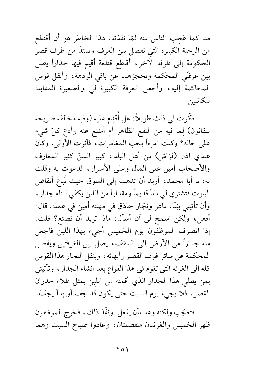 فكّرت في ذلك طويلاً: هل أُقدِم عليه (وفيه مخالفة صريحة للقانون) لِما فيه من النفع الظاهر أم أمتنع عنه وأدع كلّ شيء على حاله؟ وكنت امرءاً يحب المغامرات، فآثرت الأولى. وكان عندي آذن (فرّاش) من أهل البلد، كبير السنّ كثير المعارف والأصحاب أمين على المال وعلى الأسرار، فدعوت به وقلت له: يا أبا محمد، أريد أن تذهب إلى السوق حيث تُباع أنقاض البيوت فتشتري لي باباً قديماً ومقداراً من اللبِن يكفي لبناء جدار، وأن تأتيني ببَنّاء ماهر ونجّار حاذق في مهنته أمين في عمله. قال: أفعل، ولكن اسمح لي أن أسأل: ماذا تريد أن تصنع؟ قلت: إذا انصرف الموظفون يوم الخميس أجيء بهذا اللبن فأجعل منه جداراً من الأرض إلى السقف، يصل بين الغرفتين ويفصل المحكمة عن سائر غرف القصر وأبهائه، وينقل النجار هذا القوس كله إلى الغرفة التي تقوم في هذا الفراغ بعد إنشاء الجدار، وتأتيني بمن يطلي هذا الجدار الذي أقمته من اللبِن بمثل طلاء جدران القصر، فلا يجيء يوم السبت حتّى يكون قد جفّ أو بدأ يجفّ.