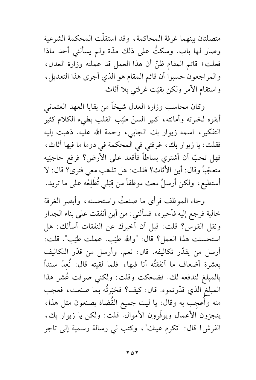 وجاء الموظف فرأى ما صنعتُ واستحسنه، وأبصر الغرفة خالية فرجع إليه فأخبره، فسألني: من أين أنفقت على بناء الجدار ونقل القوس؟ قلت: قبل أن أخبرك عن النفقات أسألك: هل استحسنت هذا العمل؟ قال: "والله طيّب. عملت طيّب". قلت: أرسل من يقدّر تكاليفه. قال: نعم. وأرسل من قدّر التكاليف بعشرة أضعاف ما أنفقتُه أنا فيها، فلما لقيته قال: نُعِدّ سنداً بالمبلغ لندفعه لك. فضحكت وقلت: ولكني صرفت عُشر هذا المبلغ الذي قدّرتموه. قال: كيف؟ فخبّرتُه بما صنعت، فعجب منه وأُعجِب به وقال: يا ليت جميع القُضاة يصنعون مثل هذا، ينجزون الأعمال ويوفّرون الأموال. قلت: ولكن يا زيوار بك، الفرش! قال: "تكرم عينك"، وكتب لي رسالة رسمية إلى تاجر