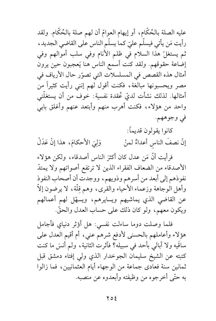 فرأيت أنّ مَن عدل كان أكثرَ الناس أصدقاء، ولكن هؤلاء الأصدقاء من الضعاف الفقراء الذين لا ترتفع أصواتهم ولا يمتدّ نفوذهم إلى أبعد من أسرهم وذويهم، ووجدت أن أصحاب النفوذ وأهل الوجاهة وزعماء الأحياء والقرى، وهم قِلّة، لا يرضون إلاّ عن القاضي الذي يماشيهم ويسايرهم، ويسهّل لهم أعمالهم ويكون معهم، ولو كان ذلك على حساب العدل والحقّ.