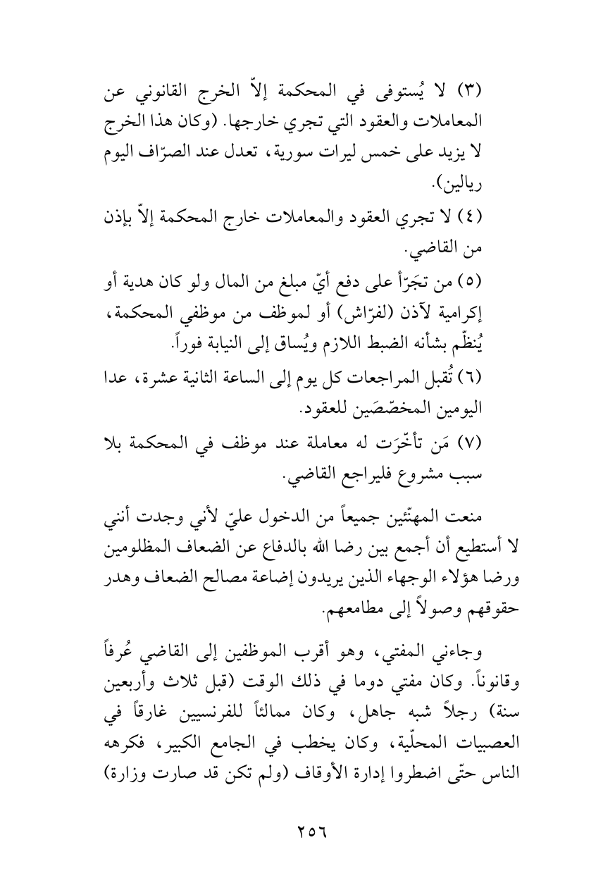 (3) لا يُستوفى في المحكمة إلاّ الخرج القانوني عن المعاملات والعقود التي تجري خارجها. (وكان هذا الخرج لا يزيد على خمس ليرات سورية، تعدل عند الصرّاف اليوم ريالين).