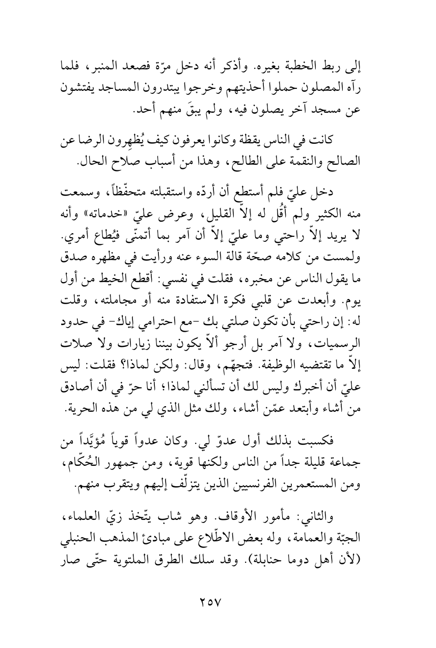 إلى ربط الخطبة بغيره. وأذكر أنه دخل مرّة فصعد المنبر، فلما رآه المصلون حملوا أحذيتهم وخرجوا يبتدرون المساجد يفتشون عن مسجد آخر يصلون فيه، ولم يبقَ منهم أحد.