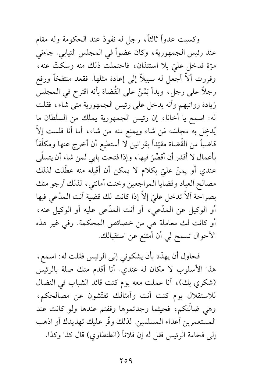 وكسبت عدواً ثالثاً، رجل له نفوذ عند الحكومة وله مقام عند رئيس الجمهورية، وكان عضواً في المجلس النيابي. جاءني مرّة فدخل عليّ بلا استئذان، فاحتملت ذلك منه وسكتّ عنه، وقررت ألاّ أجعل له سبيلاً إلى إعادة مثلها. فقعد منتفخاً ورفع رجلاً على رجل، وبدأ يَمُنّ على القُضاة بأنه اقترح في المجلس زيادة رواتبهم وأنه يدخل على رئيس الجمهورية متى شاء، فقلت له: اسمع يا أخانا، إن رئيس الجمهورية يملك من السلطان ما يُدخِل به مجلسَه مَن شاء ويمنع منه من شاء، أما أنا فلست إلاّ قاضياً من القُضاة مقيّداً بقوانين لا أستطيع أن أخرج عنها ومكلّفاً بأعمال لا أقدر أن أقصِّرَ فيها، وإذا فتحت بابي لمن شاء أن يتسلّى عندي أو يمنّ عليّ بكلام لا يمكن أن أقبله منه عطّلت لذلك مصالح العباد وقضايا المراجعين وخنت أمانتي، لذلك أرجو منك بصراحة ألاّ تدخل عليّ إلاّ إذا كانت لك قضية أنت المدّعي فيها أو الوكيل عن المدّعي، أو أنت المدّعى عليه أو الوكيل عنه، أو كانت لك معاملة هي من خصائص المحكمة. وفي غير هذه الأحوال تسمح لي أن أمتنع عن استقبالك.