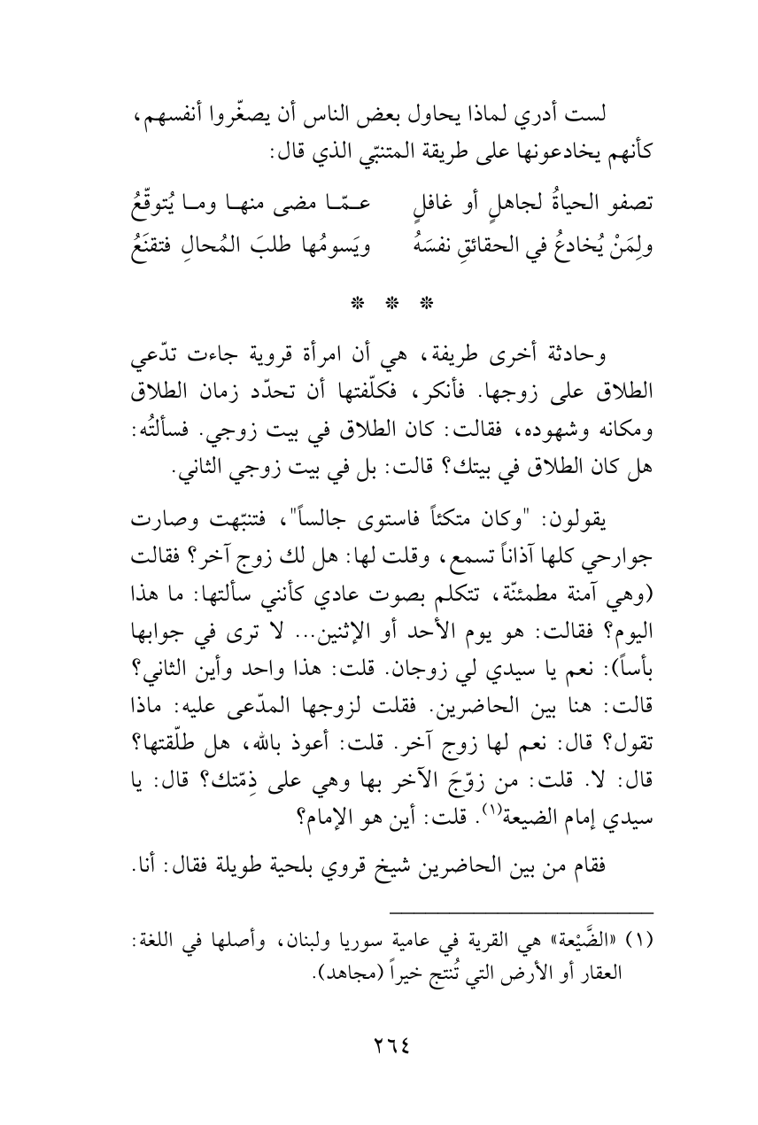 يقولون: "وكان متكئاً فاستوى جالساً"، فتنبّهت وصارت جوارحي كلها آذاناً تسمع، وقلت لها: هل لك زوج آخر؟ فقالت (وهي آمنة مطمئنّة، تتكلم بصوت عادي كأنني سألتها: ما هذا اليوم؟ فقالت: هو يوم الأحد أو الإثنين ... لا ترى في جوابها بأساً): نعم يا سيدي لي زوجان. قلت: هذا واحد وأين الثاني؟ قالت: هنا بين الحاضرين. فقلت لزوجها المدّعى عليه: ماذا تقول؟ قال: نعم لها زوج آخر. قلت: أعوذ بالله، هل طلّقتها؟ قال: لا. قلت: من زوّجَ الآخر بها وهي على ذِمّتك؟ قال: يا سيدي إمام الضيعة (¬1). قلت: أين هو الإمام؟