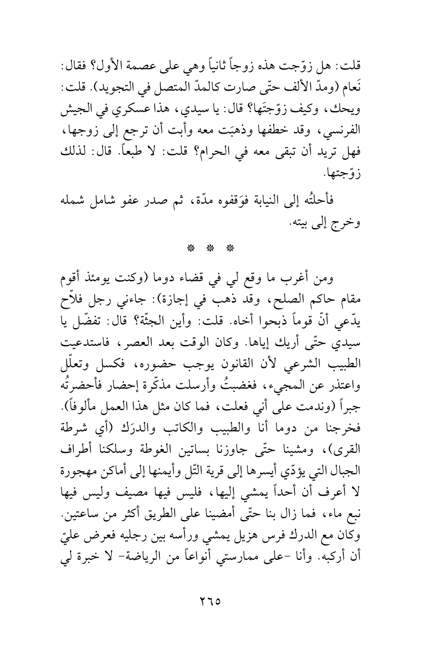 قلت: هل زوّجت هذه زوجاً ثانياً وهي على عصمة الأول؟ فقال: نَعام (ومدّ الألف حتّى صارت كالمدّ المتصل في التجويد). قلت: ويحك، وكيف زوّجتَها؟ قال: يا سيدي، هذا عسكري في الجيش الفرنسي، وقد خطفها وذهبَت معه وأبت أن ترجع إلى زوجها، فهل تريد أن تبقى معه في الحرام؟ قلت: لا طبعاً. قال: لذلك زوّجتها.