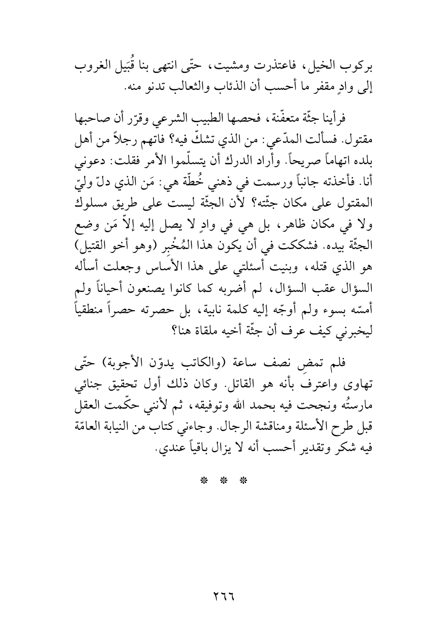 فلم تمضِ نصف ساعة (والكاتب يدوّن الأجوبة) حتّى تهاوى واعترف بأنه هو القاتل. وكان ذلك أول تحقيق جنائي مارستُه ونجحت فيه بحمد الله وتوفيقه، ثم لأنني حكّمت العقل قبل طرح الأسئلة ومناقشة الرجال. وجاءني كتاب من النيابة العامّة فيه شكر وتقدير أحسب أنه لا يزال باقياً عندي.