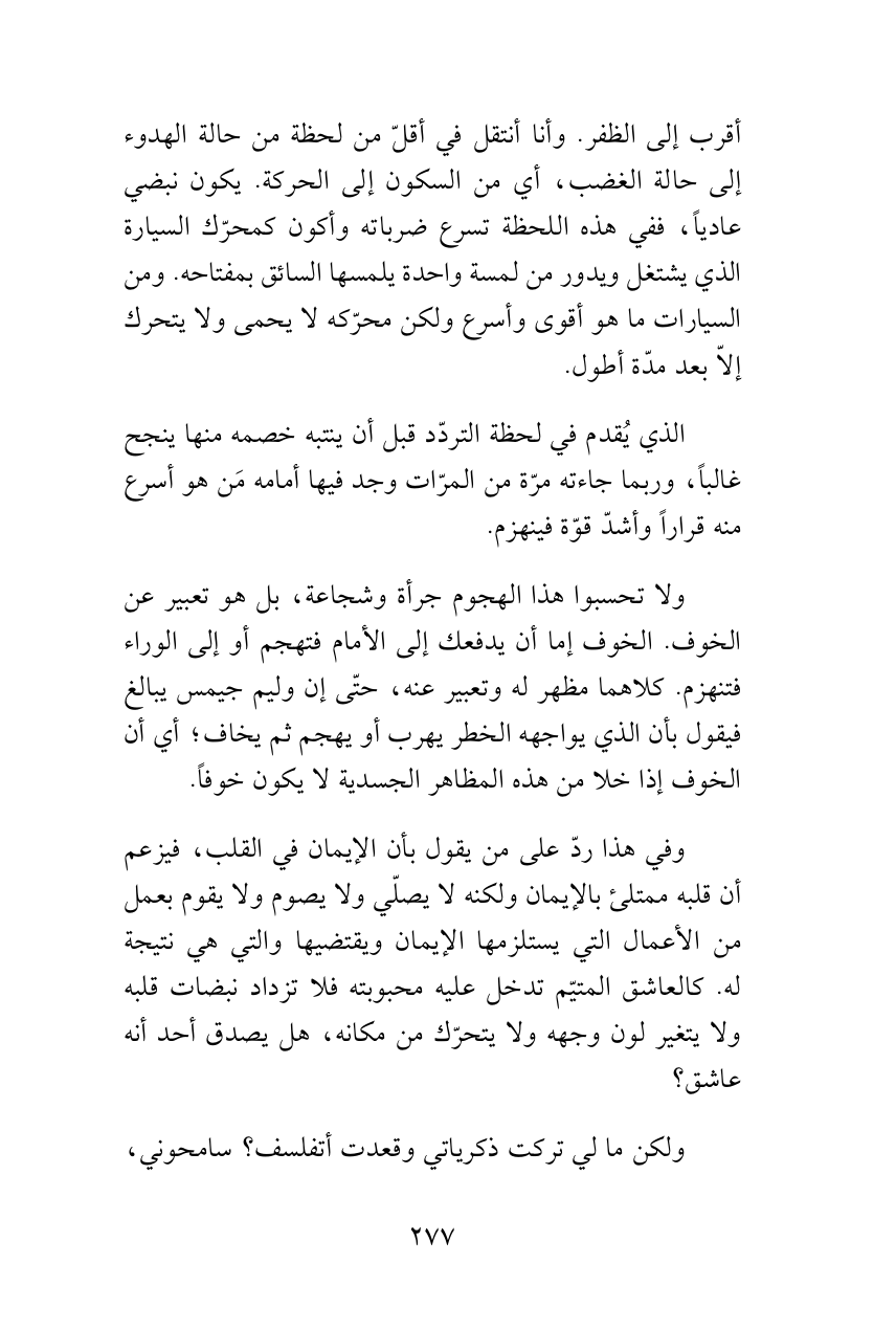 ولا تحسبوا هذا الهجوم جرأة وشجاعة، بل هو تعبير عن الخوف. الخوف إما أن يدفعك إلى الأمام فتهجم أو إلى الوراء فتنهزم. كلاهما مظهر له وتعبير عنه، حتّى إن وليم جيمس يبالغ فيقول بأن الذي يواجهه الخطر يهرب أو يهجم ثم يخاف؛ أي أن الخوف إذا خلا من هذه المظاهر الجسدية لا يكون خوفاً.