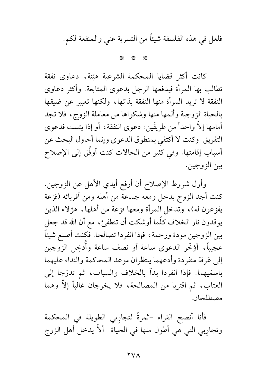 كانت أكثر قضايا المحكمة الشرعية هيّنة، دعاوى نفقة تطالب بها المرأة فيدفعها الرجل بدعوى المتابعة. وأكثر دعاوى النفقة لا تريد المرأة منها النفقة بذاتها، ولكنها تعبير عن ضيقها بالحياة الزوجية وألمها منها وشكواها من معاملة الزوج، فلا تجد أمامها إلاّ واحداً من طريقَين: دعوى النفقة، أو إذا يئست فدعوى التفريق. وكنت لا أكتفي بمنطوق الدعوى وإنما أحاول البحث عن أسباب إقامتها. وفي كثير من الحالات كنت أوفَّق إلى الإصلاح بين الزوجين.