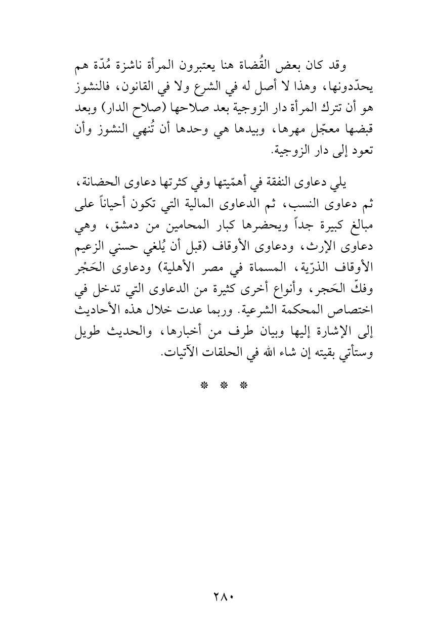 يلي دعاوى النفقة في أهمّيتها وفي كثرتها دعاوى الحضانة، ثم دعاوى النسب، ثم الدعاوى المالية التي تكون أحياناً على مبالغ كبيرة جداً ويحضرها كبار المحامين من دمشق، وهي دعاوى الإرث، ودعاوى الأوقاف (قبل أن يُلغي حسني الزعيم الأوقاف الذرّية، المسماة في مصر الأهلية) ودعاوى الحَجْر وفكّ الحَجر، وأنواع أخرى كثيرة من الدعاوى التي تدخل في اختصاص المحكمة الشرعية. وربما عدت خلال هذه الأحاديث إلى الإشارة إليها وبيان طرف من أخبارها، والحديث طويل وستأتي بقيته إن شاء الله في الحلقات الآتيات.