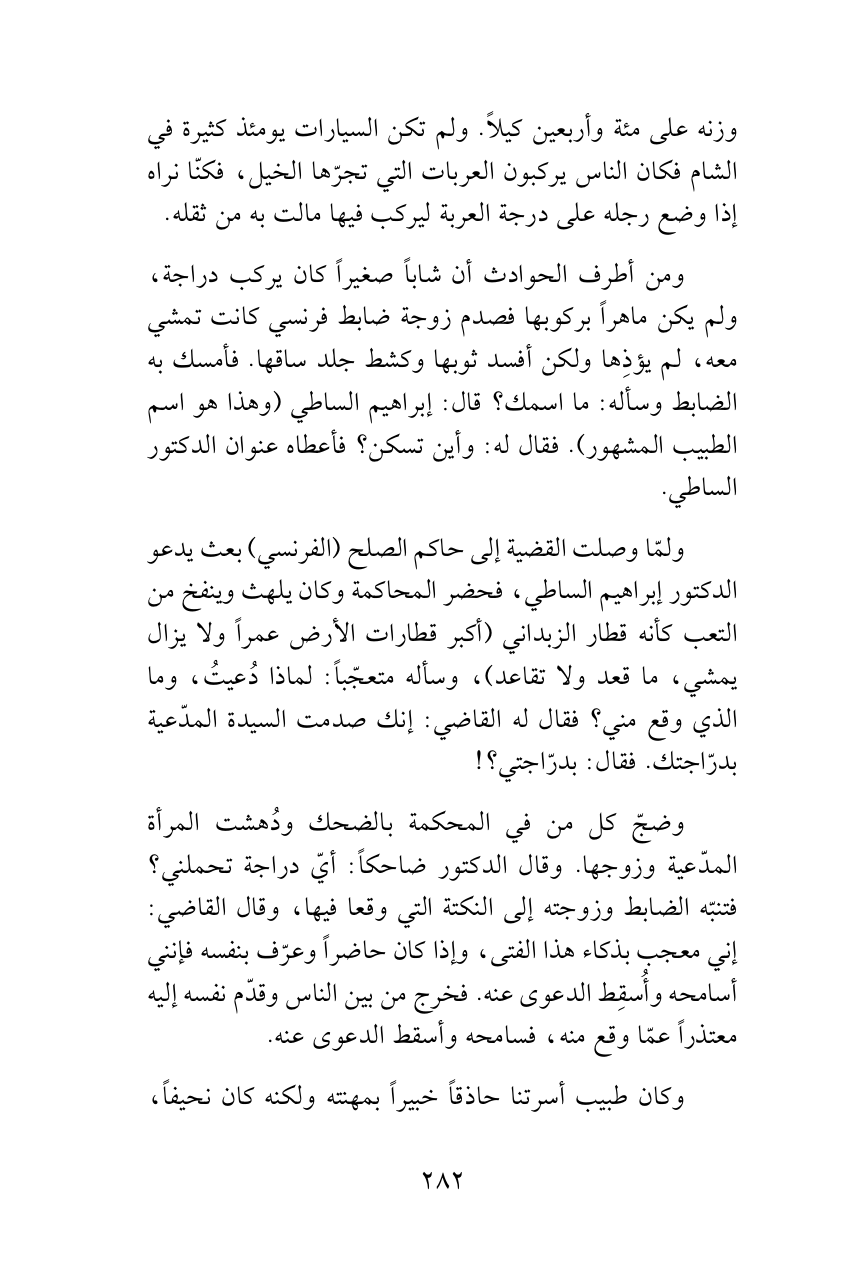 ولمّا وصلت القضية إلى حاكم الصلح (الفرنسي) بعث يدعو الدكتور إبراهيم الساطي، فحضر المحاكمة وكان يلهث وينفخ من التعب كأنه قطار الزبداني (أكبر قطارات الأرض عمراً ولا يزال يمشي، ما قعد ولا تقاعد)، وسأله متعجّباً: لماذا دُعيتُ، وما الذي وقع مني؟ فقال له القاضي: إنك صدمت السيدة المدّعية بدرّاجتك. فقال: بدرّاجتي؟!