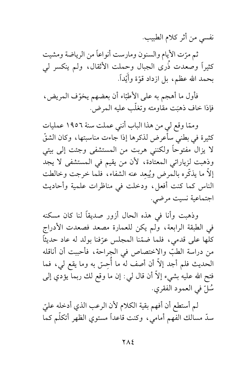 وممّا وقع لي من هذا الباب أنني عملت سنة 1956 عمليات كثيرة في بطني سأعرض لذكرها إذا جاءت مناسبتها، وكان الشقّ لا يزال مفتوحاً ولكنني هربت من المستشفى وجئت إلى بيتي وذهبت لزياراتي المعتادة، لأن من يقيم في المستشفى لا يجد إلاّ ما يذكّره بالمرض ويُبعِد عنه الشفاء، فلما خرجت وخالطت الناس كما كنت أفعل، ودخلت في مناظرات علمية وأحاديث اجتماعية نسيت مرضي.