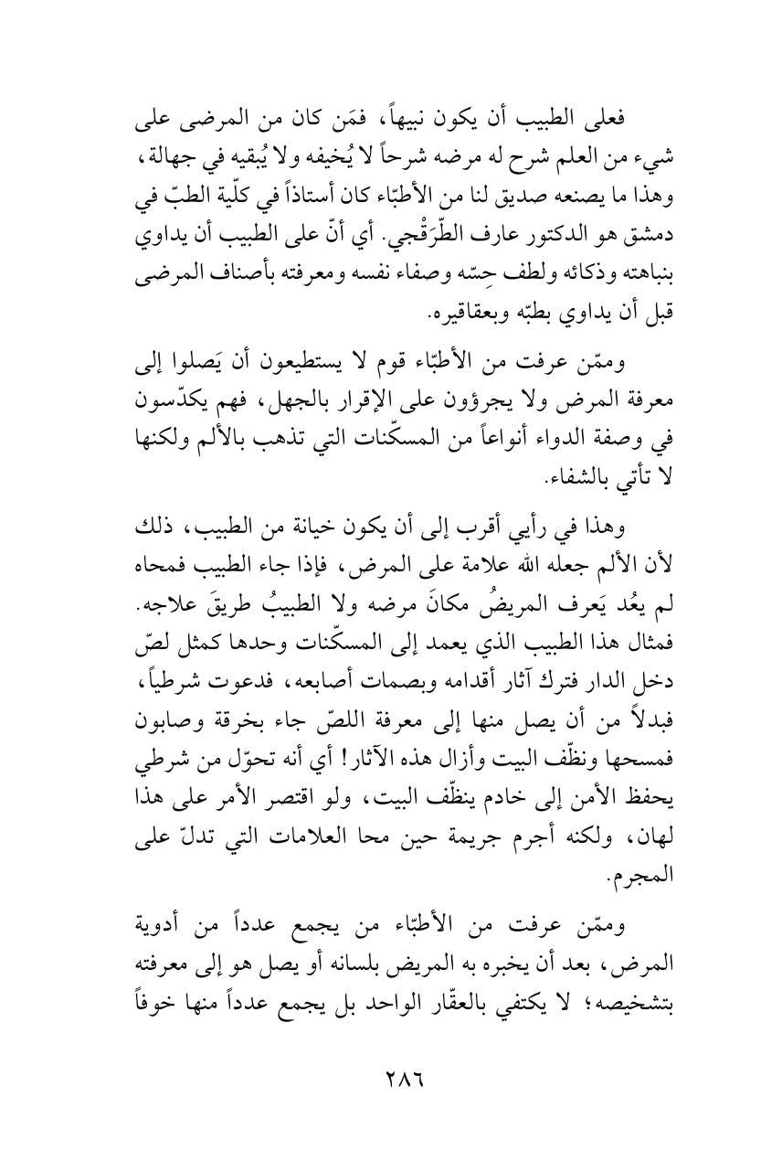 وممّن عرفت من الأطبّاء قوم لا يستطيعون أن يَصلوا إلى معرفة المرض ولا يجرؤون على الإقرار بالجهل، فهم يكدّسون في وصفة الدواء أنواعاً من المسكّنات التي تذهب بالألم ولكنها لا تأتي بالشفاء.