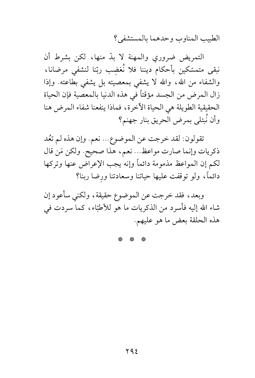 وبعد، فقد خرجت عن الموضوع حقيقة، ولكني سأعود إن شاء الله إليه فأسرد من الذكريات ما هو للأطبّاء، كما سردت في هذه الحلقة بعض ما هو عليهم.
