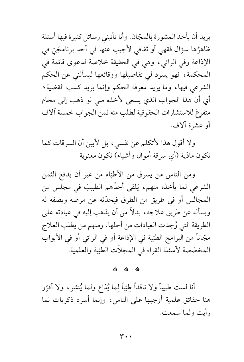 يريد أن يأخذ المشورة بالمجّان. وأنا تأتيني رسائل كثيرة فيها أسئلة ظاهرُها سؤال فقهي أو ثقافي لأجيب عنها في أحد برنامجَيّ في الإذاعة وفي الرائي، وهي في الحقيقة خلاصة لدعوى قائمة في المحكمة، فهو يسرد لي تفاصيلها ووقائعها ليسألني عن الحكم الشرعي فيها، وما يريد معرفة الحكم وإنما يريد كسب القضية؛ أي أن هذا الجواب الذي يسعى لأخذه مني لو ذهب إلى محام متفرغ للاستشارات الحقوقية لطلب منه ثمن الجواب خمسة آلاف أو عشرة آلاف.