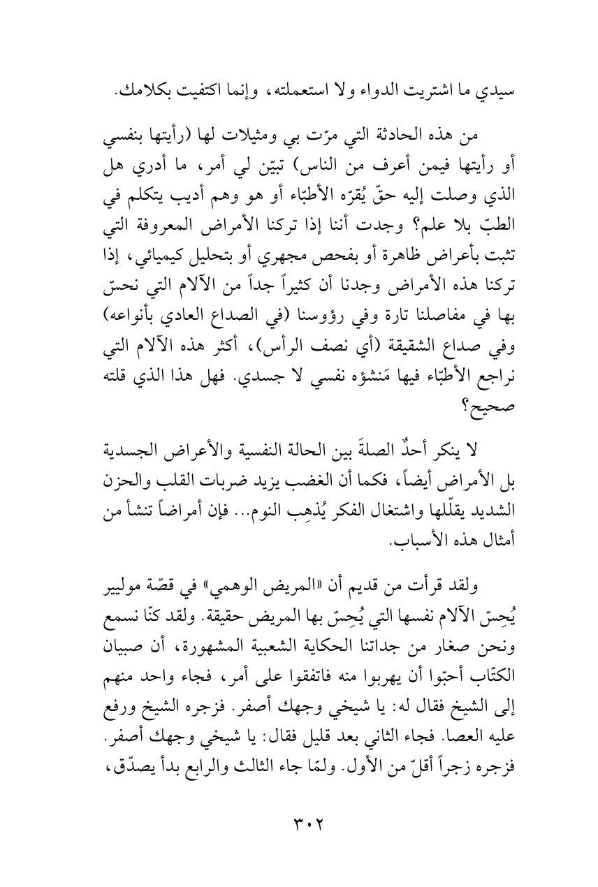 من هذه الحادثة التي مرّت بي ومثيلات لها (رأيتها بنفسي أو رأيتها فيمن أعرف من الناس) تبيّن لي أمر، ما أدري هل الذي وصلت إليه حقّ يُقرّه الأطبّاء أو هو وهم أديب يتكلم في الطبّ بلا علم؟ وجدت أننا إذا تركنا الأمراض المعروفة التي تثبت بأعراض ظاهرة أو بفحص مجهري أو بتحليل كيميائي، إذا تركنا هذه الأمراض وجدنا أن كثيراً جداً من الآلام التي نحسّ بها في مفاصلنا تارة وفي رؤوسنا (في الصداع العادي بأنواعه) وفي صداع الشقيقة (أي نصف الرأس)، أكثر هذه الآلام التي نراجع الأطبّاء فيها مَنشؤه نفسي لا جسدي. فهل هذا الذي قلته صحيح؟