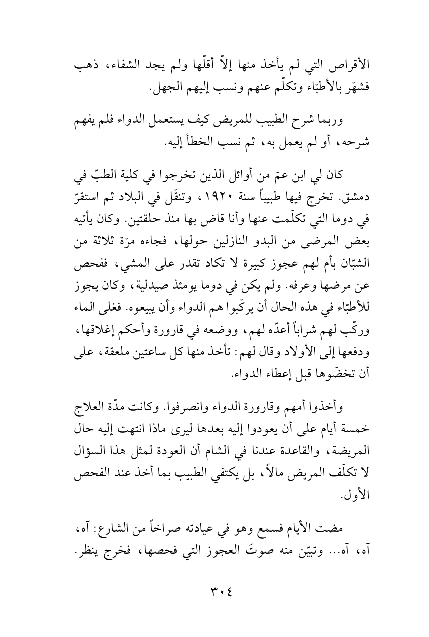 وأخذوا أمهم وقارورة الدواء وانصرفوا. وكانت مدّة العلاج خمسة أيام على أن يعودوا إليه بعدها ليرى ماذا انتهت إليه حال المريضة، والقاعدة عندنا في الشام أن العودة لمثل هذا السؤال لا تكلّف المريض مالاً، بل يكتفي الطبيب بما أخذ عند الفحص الأول.