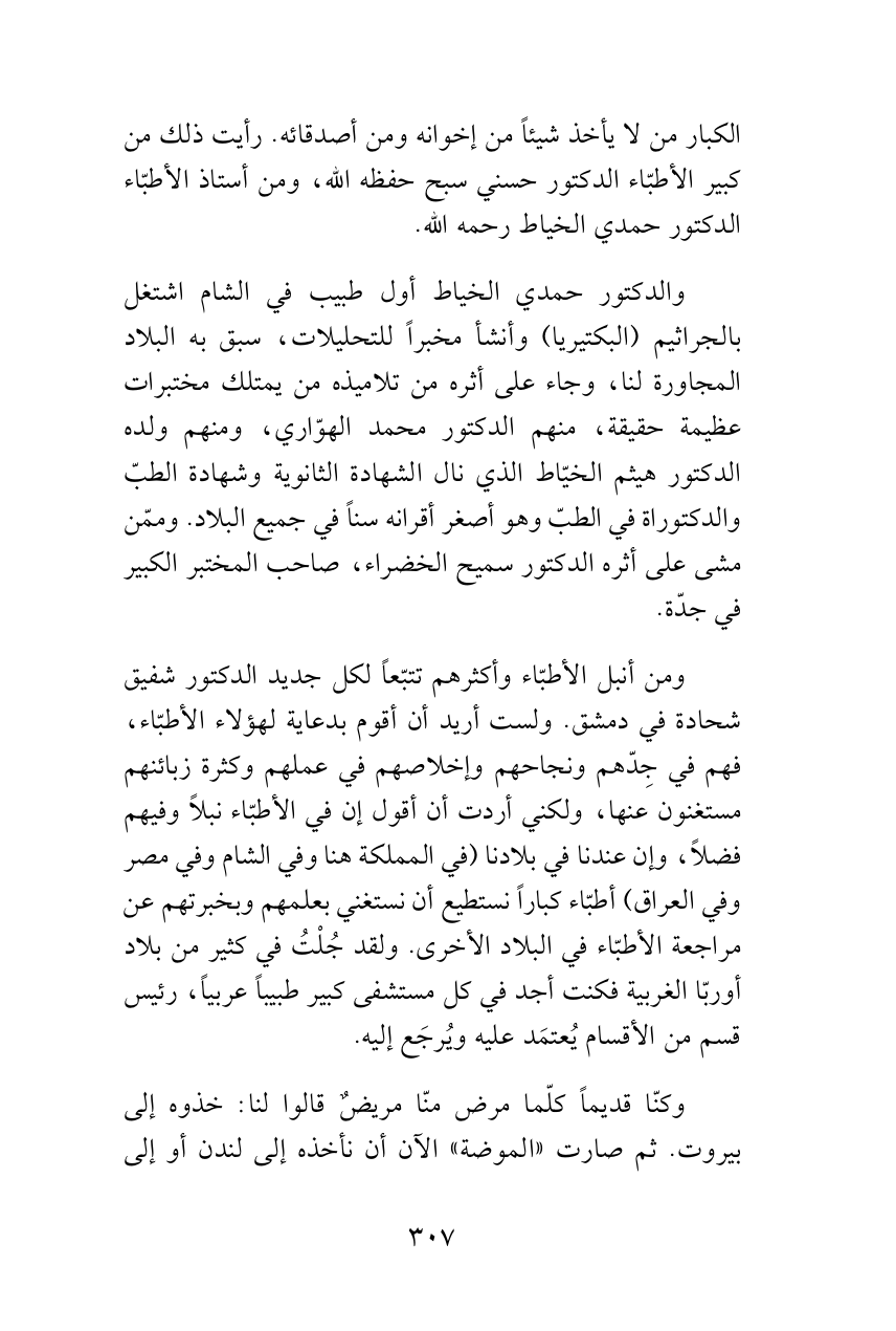 ومن أنبل الأطبّاء وأكثرهم تتبّعاً لكل جديد الدكتور شفيق شحادة في دمشق. ولست أريد أن أقوم بدعاية لهؤلاء الأطبّاء، فهم في جِدّهم ونجاحهم وإخلاصهم في عملهم وكثرة زبائنهم مستغنون عنها، ولكني أردت أن أقول إن في الأطبّاء نبلاً وفيهم فضلاً، وإن عندنا في بلادنا (في المملكة هنا وفي الشام وفي مصر وفي العراق) أطبّاء كباراً نستطيع أن نستغني بعلمهم وبخبرتهم عن مراجعة الأطبّاء في البلاد الأخرى. ولقد جُلْتُ في كثير من بلاد أوربّا الغربية فكنت أجد في كل مستشفى كبير طبيباً عربياً، رئيس قسم من الأقسام يُعتمَد عليه ويُرجَع إليه.