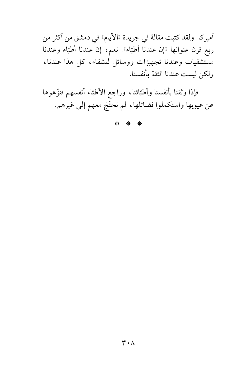 أميركا. ولقد كتبت مقالة في جريدة «الأيام» في دمشق من أكثر من ربع قرن عنوانها «إن عندنا أطبّاء». نعم، إن عندنا أطبّاء وعندنا مستشفيات وعندنا تجهيزات ووسائل للشفاء، كل هذا عندنا، ولكن ليست عندنا الثقة بأنفسنا.